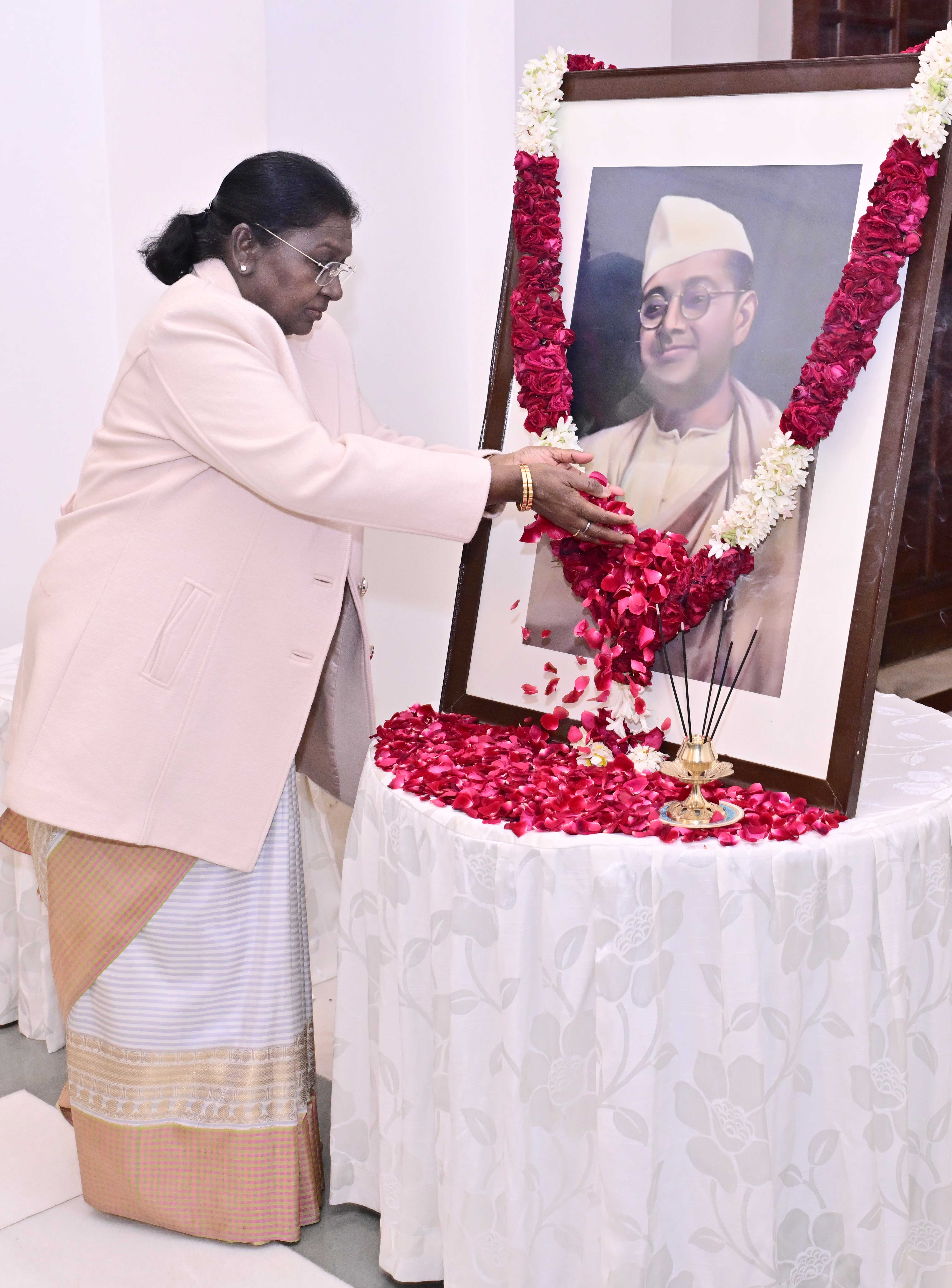 23 जनवरी, 2026 को राष्ट्रपति भवन में नेताजी सुभाष चंद्र बोस की जयंती - पराक्रम दिवस के अवसर पर उन्हें पुष्पांजलि अर्पित करते हुए भारत की राष्ट्रपति, श्रीमती द्रौपदी मुर्मु।